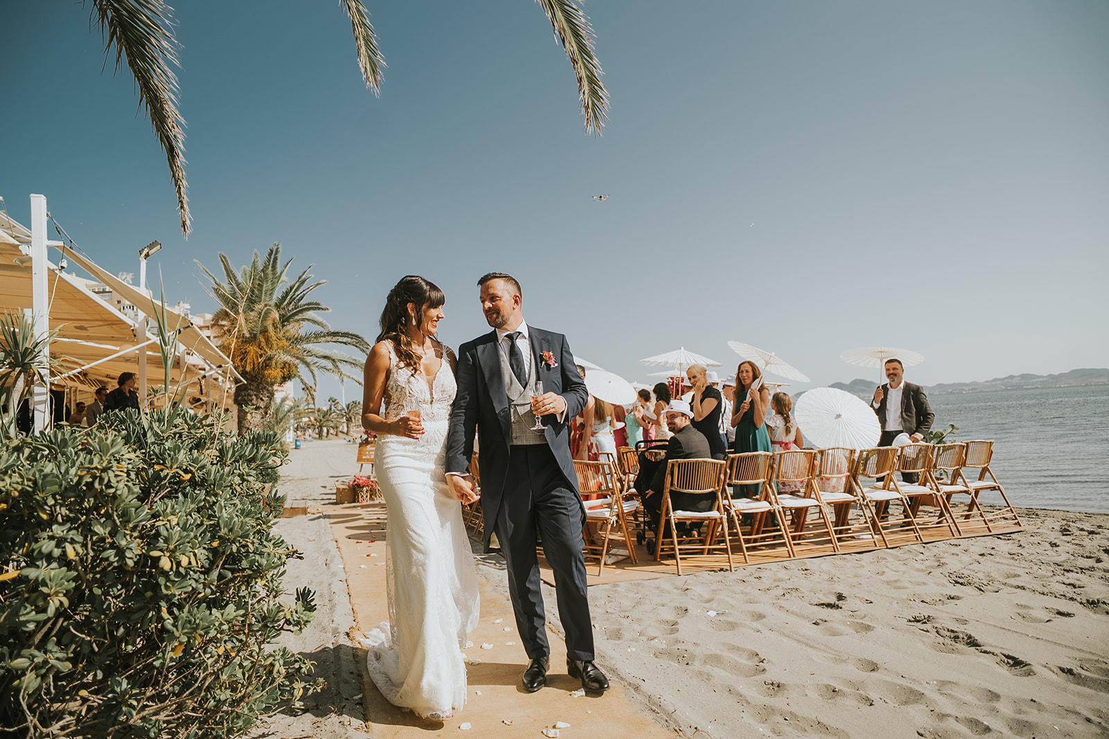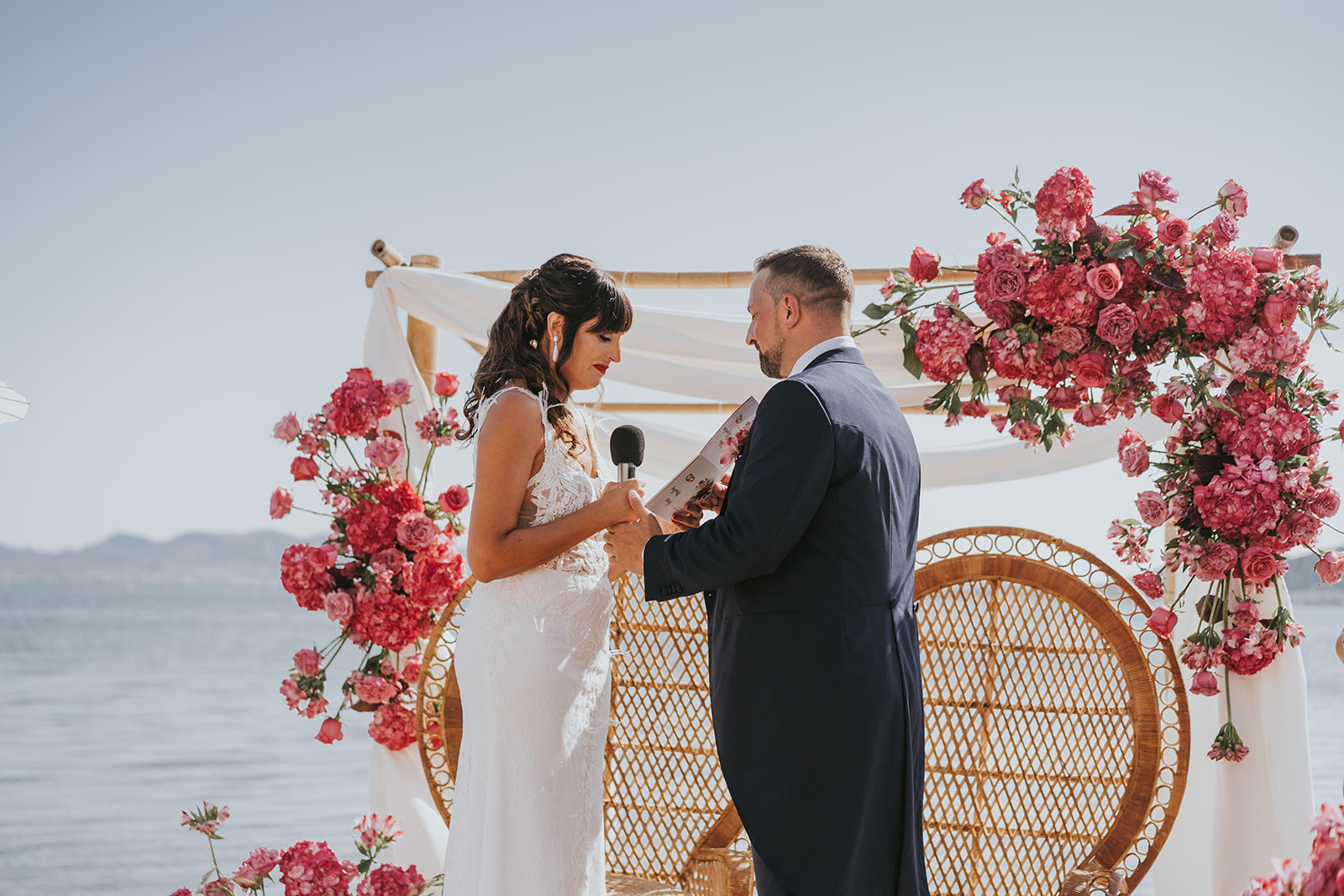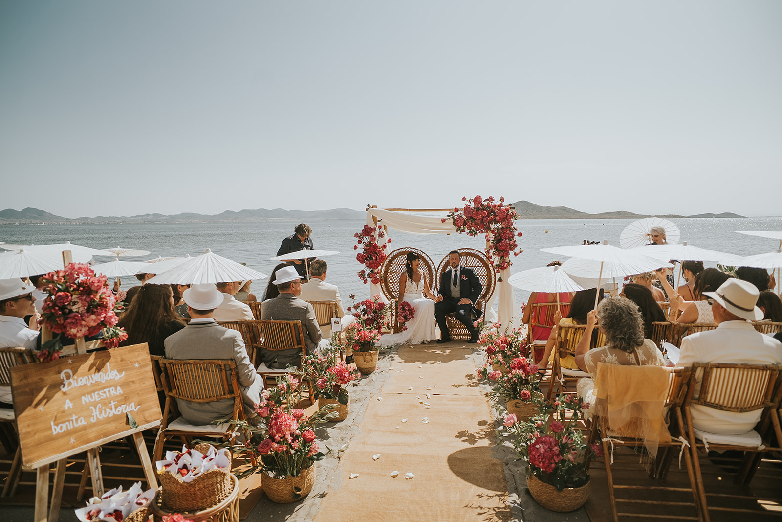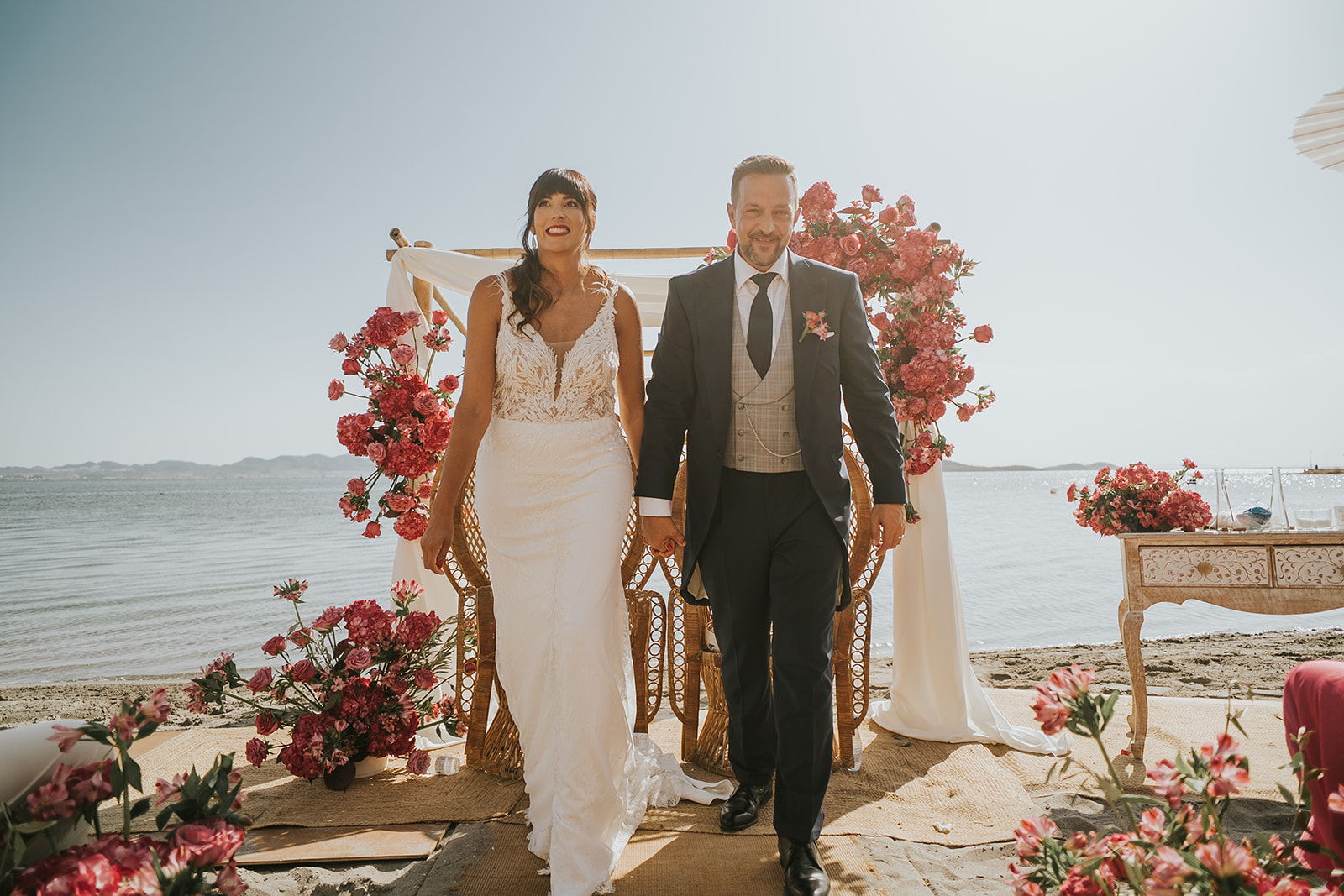 Cada detalle de esta boda frente al mar estuvo cuidado con mimo, desde el altar decorado con flores hasta la salida de los novios bajo el sol del Mediterráneo.