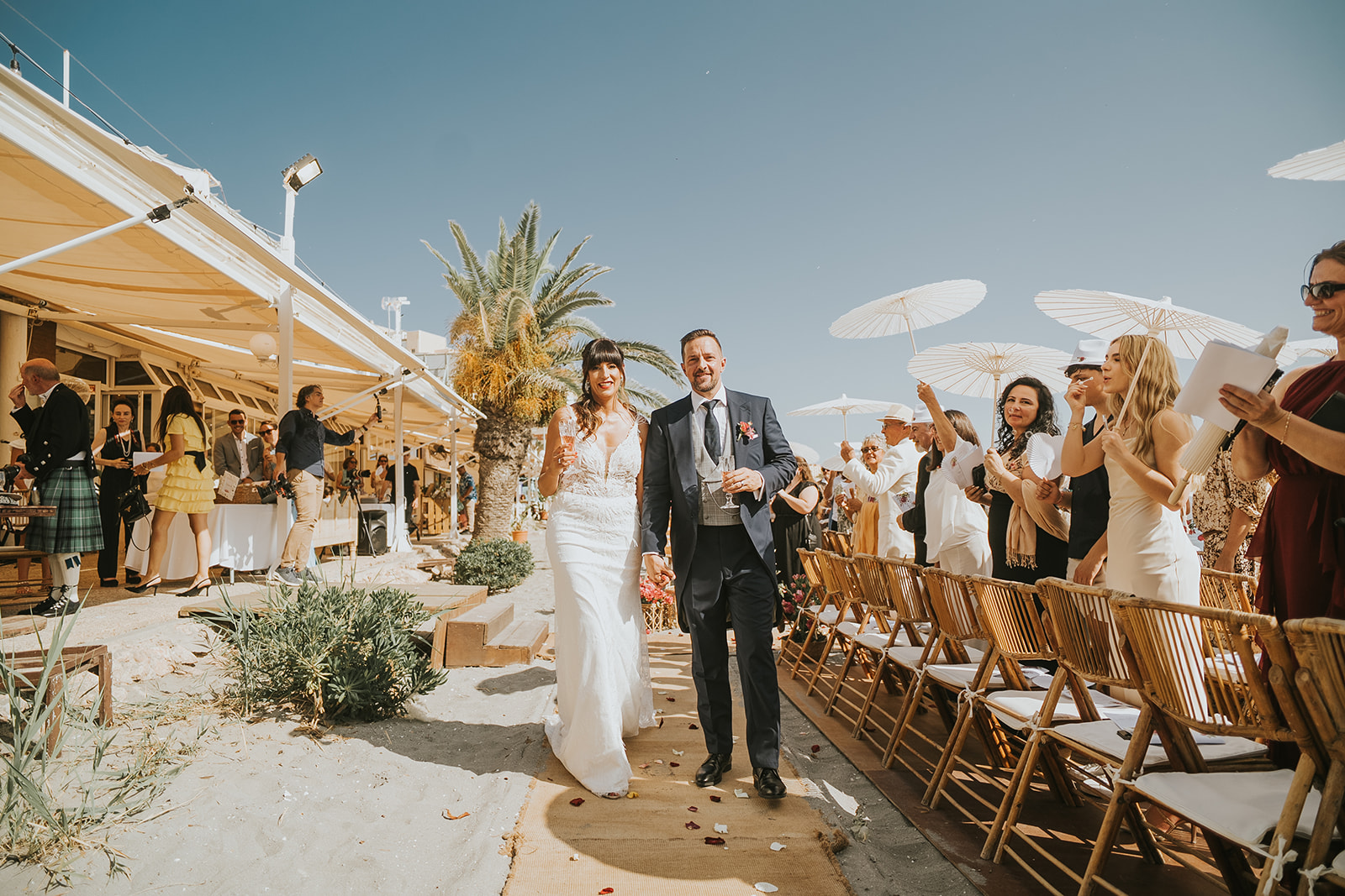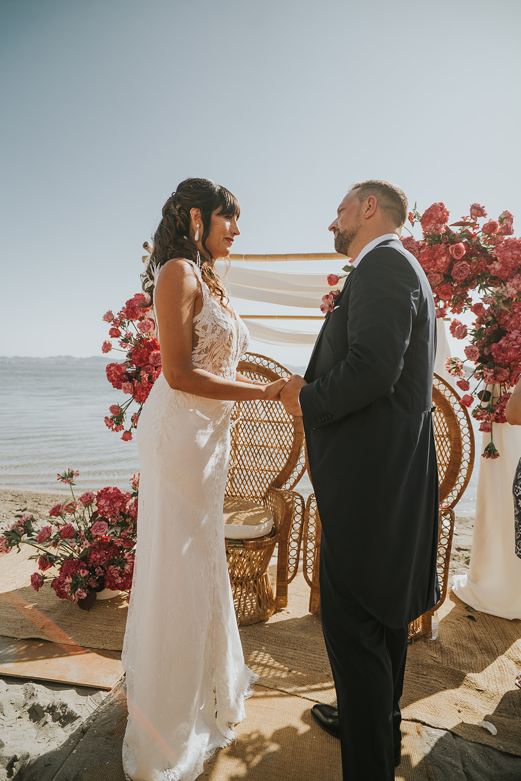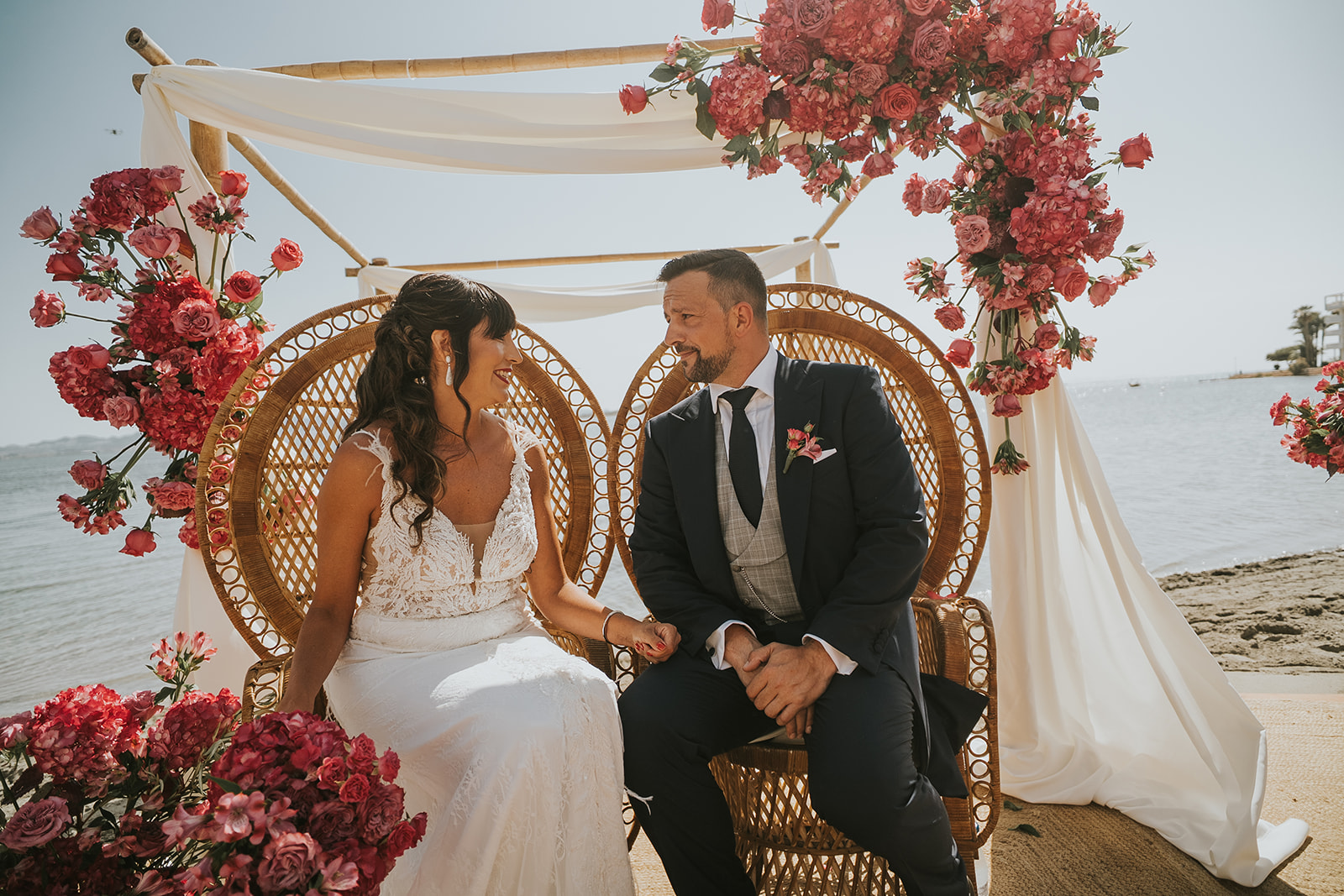 Cada detalle de esta boda frente al mar estuvo cuidado con mimo, desde el altar decorado con flores hasta la salida de los novios bajo el sol del Mediterráneo.